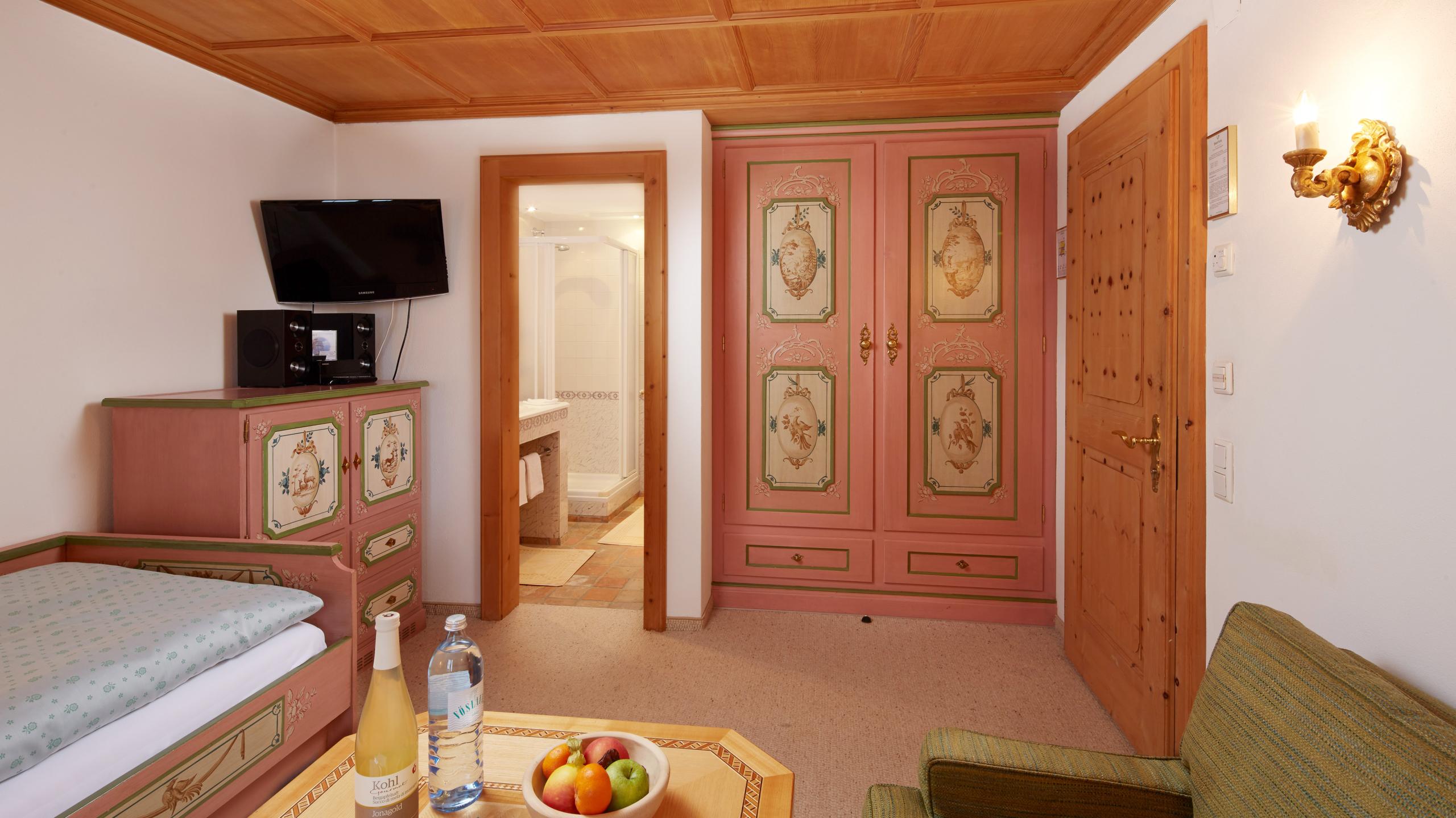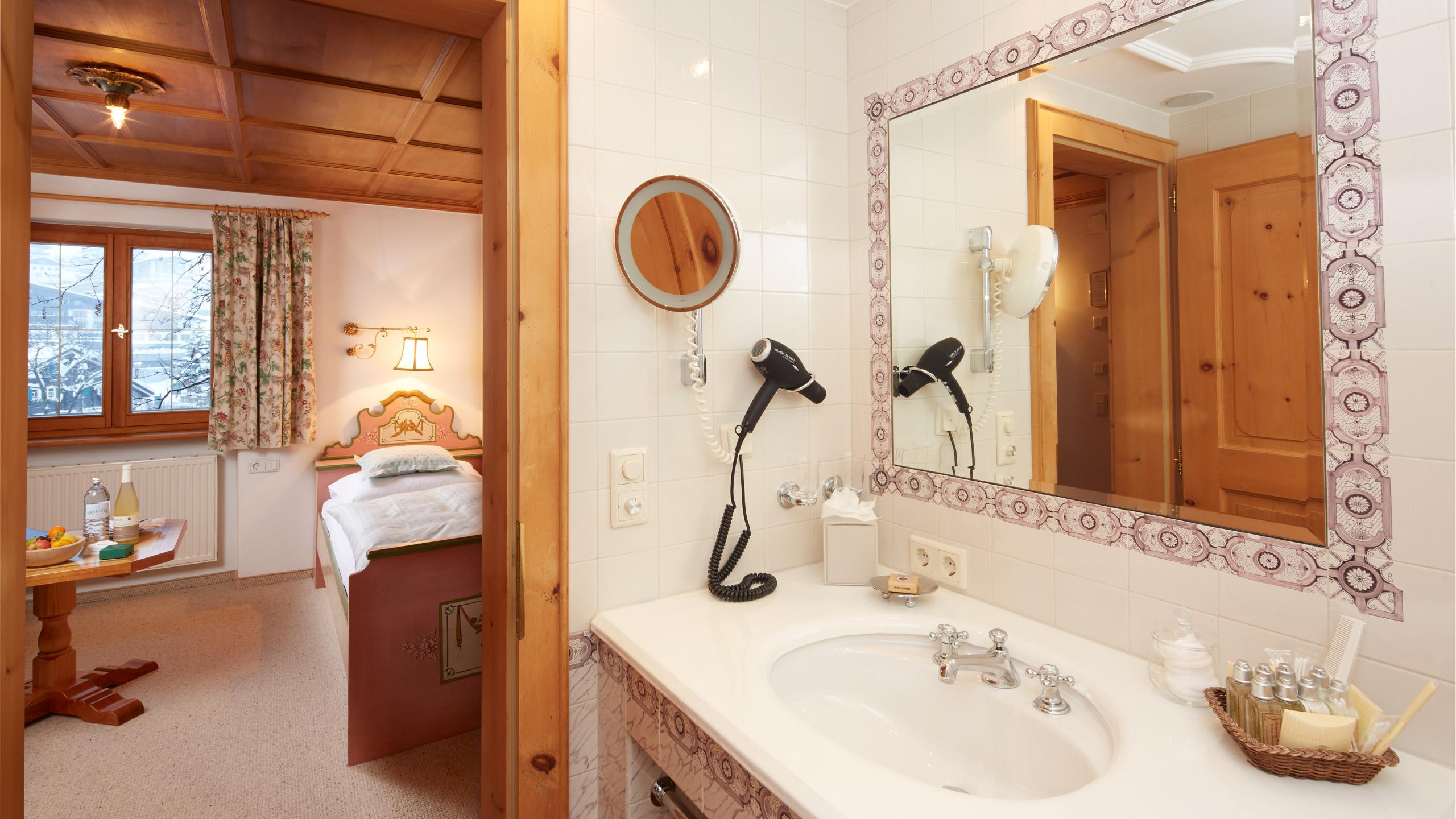 Our single rooms are all unique: up to 25 m² in size, lovingly furnished with sofa and coffee table. All single rooms have a private bathroom with tub and toilet.