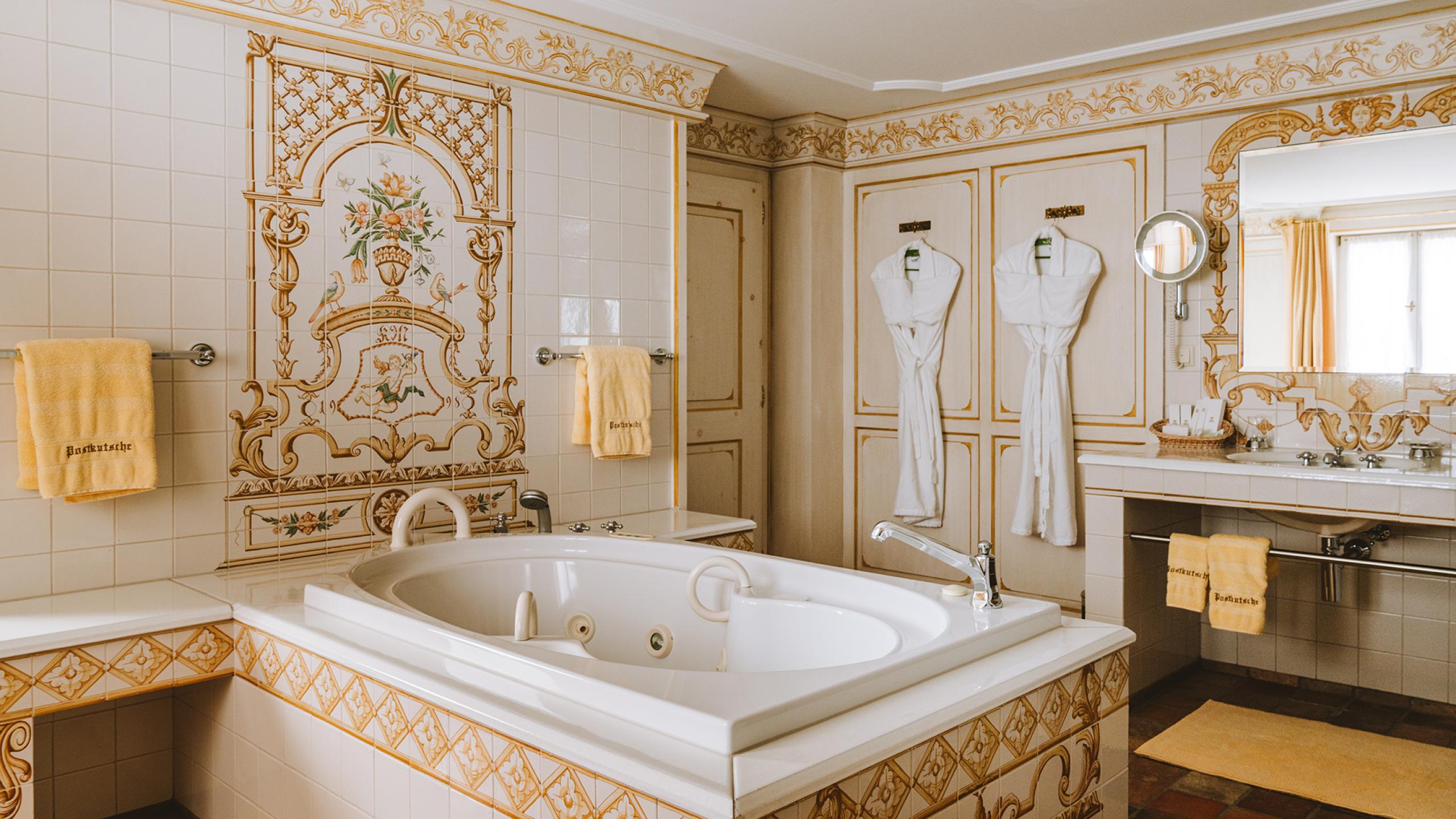 60 bis 80 m² mit Doppelbett und separatem oder räumlich abgetrenntem Wohnraum versprechen ein wahrlich fürstliches Feriendomizil. Die Fürsten Suiten sind teilweise mit offenem Kamin oder Kachelofen ausgestattet, zwei verfügen über eine eigene Terrasse. Die Bäder sind selbstverständlich alle mit Wanne ausgestattet, teilweise auch mit Bidet und Dusche mit Dampfbad.